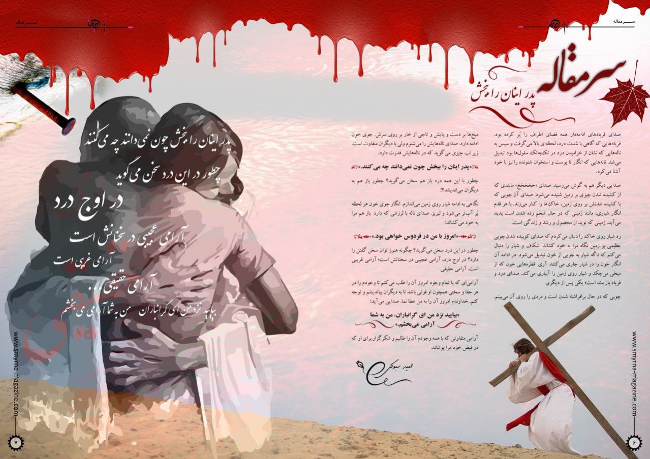 چوبی در حال برافراشته شدن است و مردی را روی آن میبینم. میخها بر دست و پایش و تاجی از خار بر روی سرش. صدای نالههایش را میشنوم که زیر لب میگوید: پدر اینان را ببخش